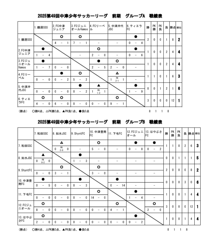 4種委員会(ジュニア)第49回中津リーグ前期 U-122025.04.20 2025年4月20日、D-ACTスポーツパーク永添で第49回中津リーグ前期 U-12第3節、第4節が行われました。第4節までの試合結果を公開します。2025.04.20 U-12リーグ 戦績表 Postシェア4種委員会(ジュニア)第49回中津リーグ前期 U-122025年度 第14回ラビットカップ中津地区予選